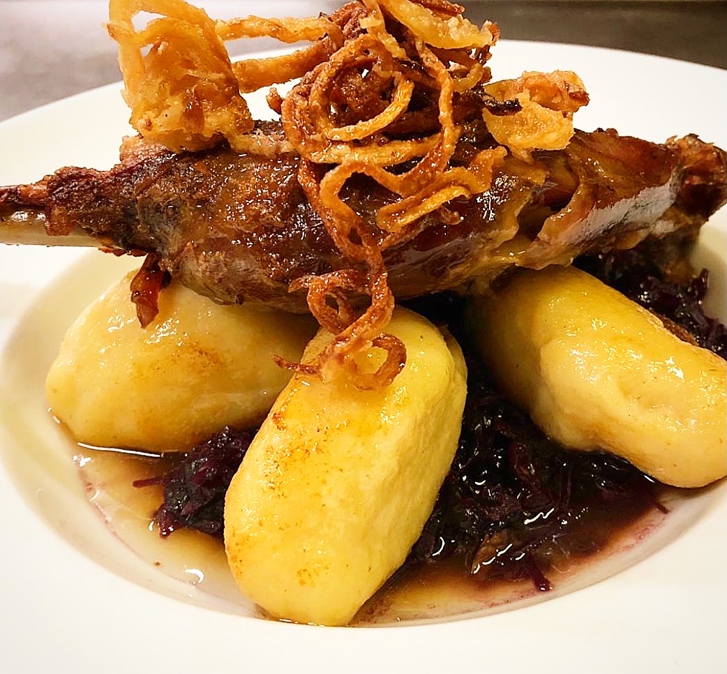 450-500g Konfitované stehno Svatomartinské husy s karlovarským knedlíkem, červeným zelí s brusinkami a vínem, posypané smaženou vídeňskou cibulkou